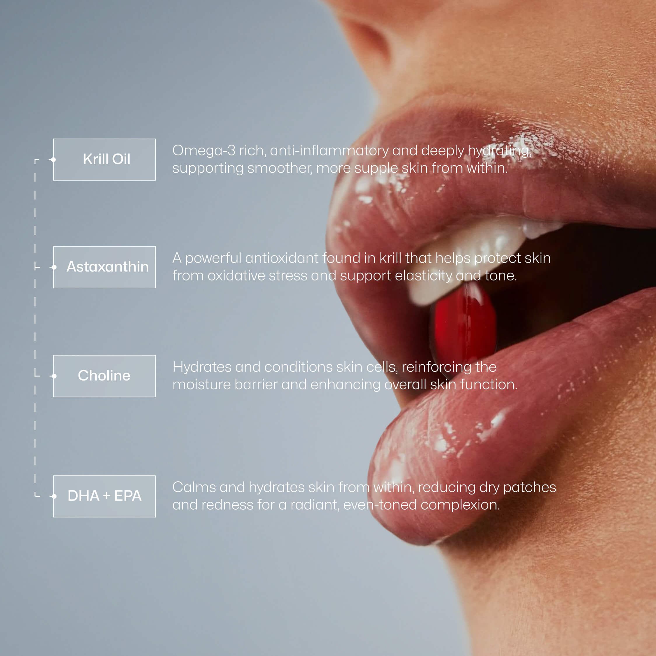 At its core is highly bioavailable krill oil, rich in omega-3s EPA and DHA, alongside astaxanthin and choline. These ingredients help restore calm, resilience and suppleness to the skin, while also supporting cognitive, joint and eye health.